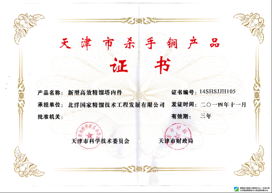 Recently, Tianjin published the second batch of identification list of "killer product" in 2014, and our company's products of "new high-efficiency distillation column internals" were listed among them.