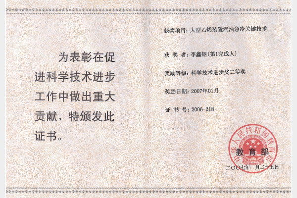 大型乙烯裝置汽油急冷關(guān)鍵技術(shù)教育部科技進(jìn)步獎(jiǎng)二等