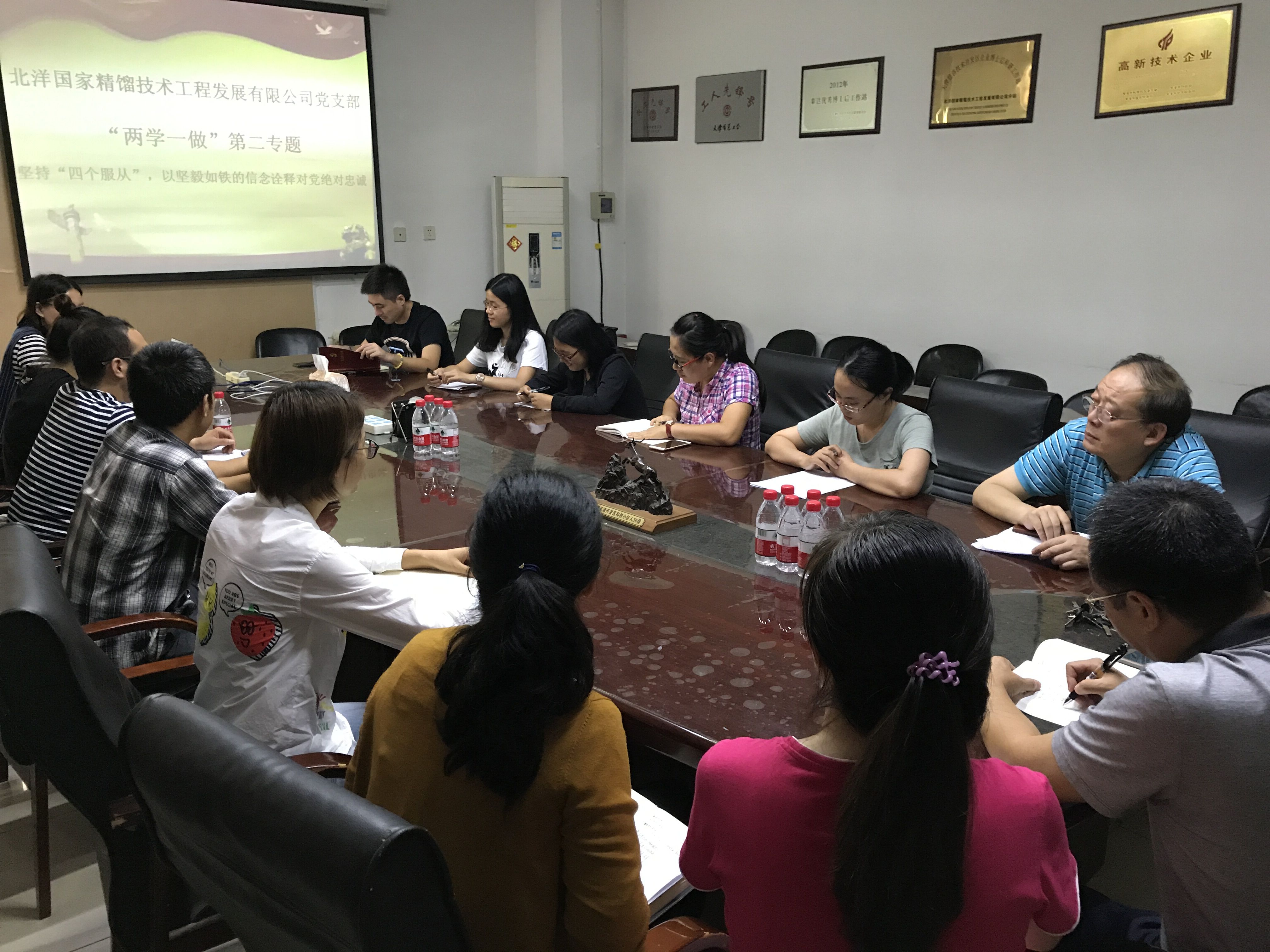 2017年9月26日,為深入貫徹落實《天津開發(fā)區(qū)開展“維護(hù)核心、鑄就忠誠、擔(dān)當(dāng)作為、抓實支部”主題教育實踐活動推進(jìn)“兩學(xué)一做”學(xué)習(xí)教育常態(tài)化制度化實施方案》,北洋國家精餾技術(shù)工程發(fā)展有限公司黨支部開展了推進(jìn)“兩學(xué)一做”學(xué)習(xí)教育常態(tài)化制度化第二專題學(xué)習(xí)討論。該學(xué)習(xí)討論主題為堅持“四個服從”,以堅毅如鐵的信念詮釋對黨絕對忠誠