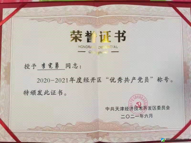 北洋國家精餾技術(shù)工程發(fā)展有限公司黨支部李憲勇同志榮獲2021年經(jīng)開區(qū)優(yōu)秀共產(chǎn)黨員稱號
