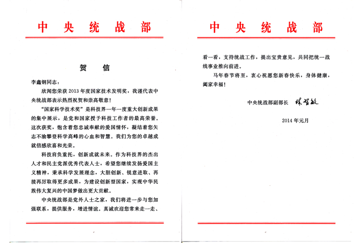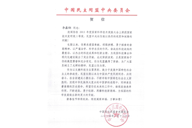 中央統(tǒng)戰(zhàn)部、民盟中央分別發(fā)來(lái)賀信 祝賀李鑫鋼教授獲國(guó)家技術(shù)發(fā)明獎(jiǎng)