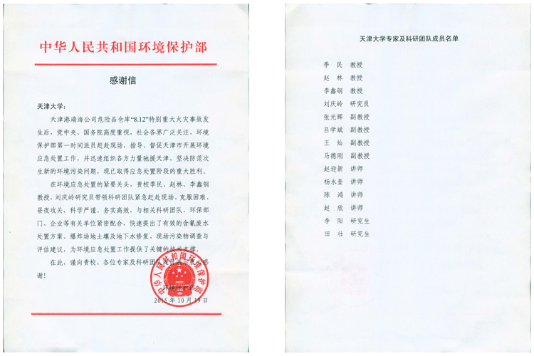 環(huán)保部發(fā)感謝信表彰李鑫鋼教授參與天津港“8.12”特大爆炸事故應(yīng)急處置工作