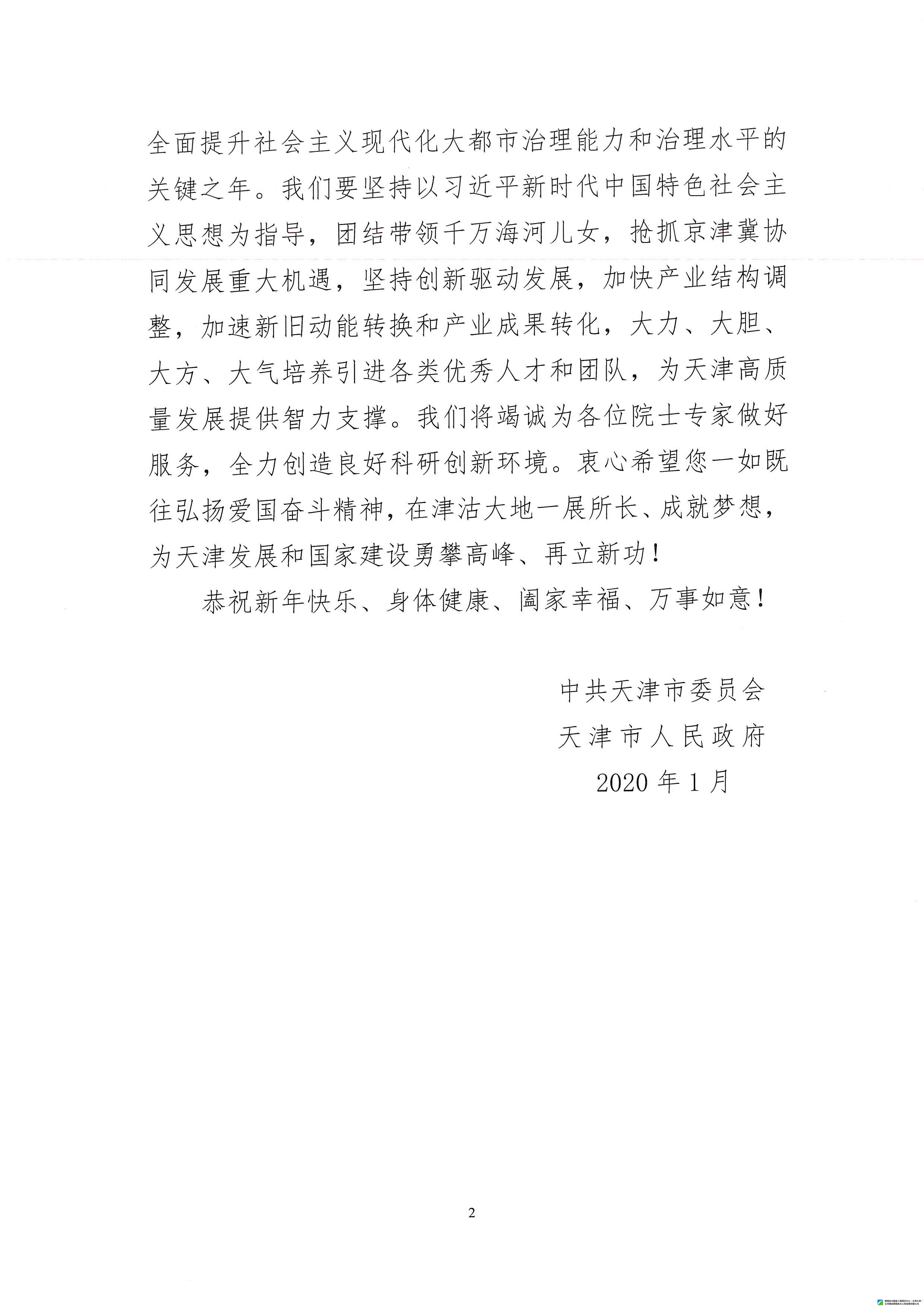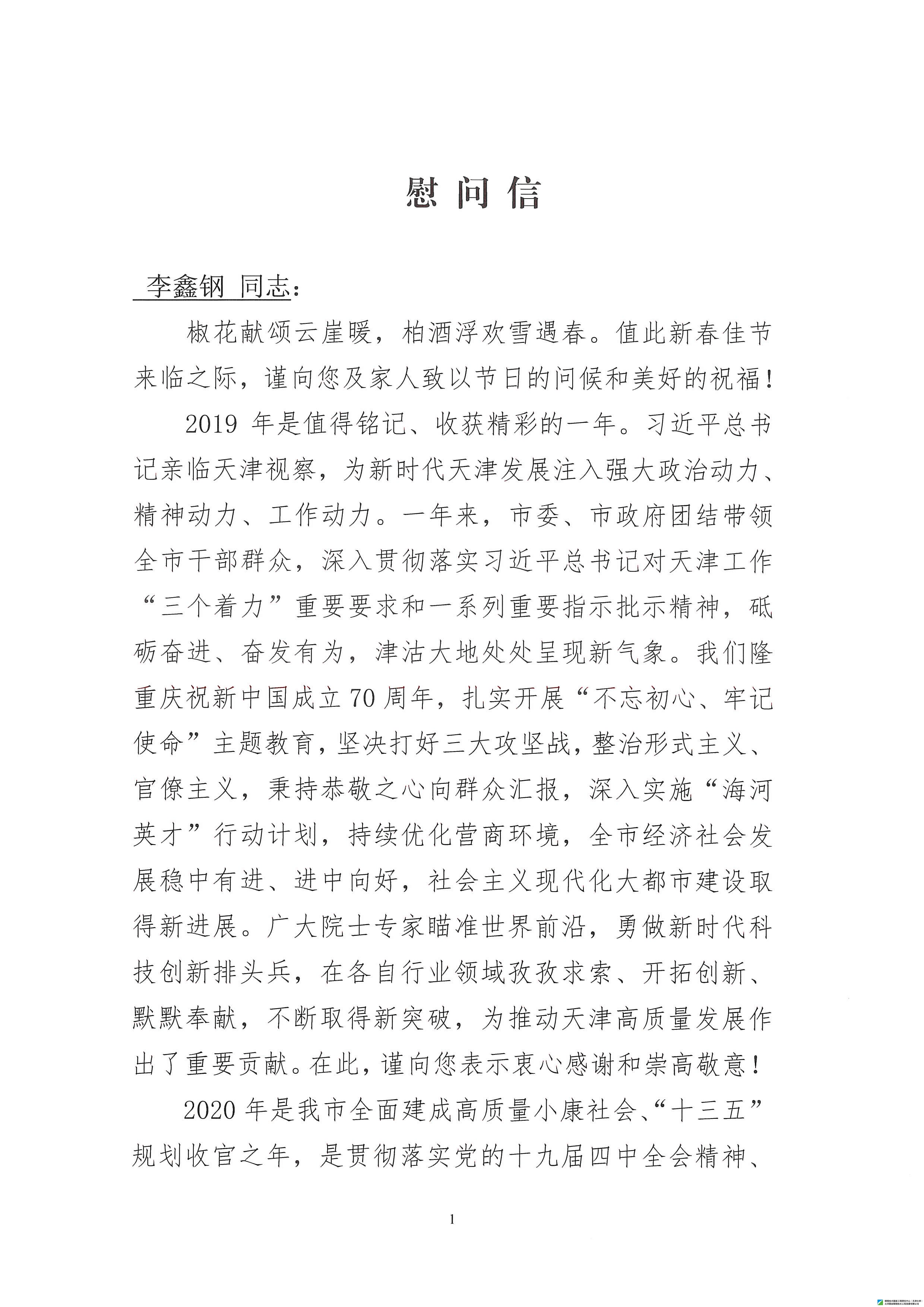 天津市委、天津人民政府給李鑫鋼教授發(fā)來(lái)新春慰問(wèn)信